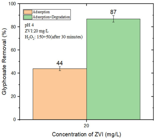 GLY removal (%) by nZVI (20 mg/L) and, where applicable (“Adsorption + Degradation”), H2O2 (150 μM at t = 0 + 50 μM at t = 30 min) at pH 4.