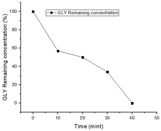 It has been reported that, by using nZVI (22.4 mg/L) and H2O2 (0.1 mmol/L) at pH 3, chlorpheniramine (10 mg/L) can be completely removed at room temperature [36]. Moreover, the efficiency of the degradation of polyvinyl alcohol (PVA) reached 94% in 1 min at pH 3 with a nZVI dosage of 5 mg/L and a H2O2 concentration of 1 × 10−4 mol/L [34]. Many approaches have been attempted to remove different contaminants from water using Fenton-related processes [37,38,39,40,41,42,43,44,45]. However, GLY removal from water using nZVI, through either adsorption or degradation (nZVI/H2O2 Fenton-like system), has not yet been reported.