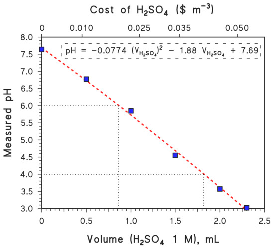 Results of tap-water titration with H2SO4 (measured pH, as a function of added volume of H2SO4 1 M). The upper X-axis plots the cost of H2SO4 addition, based on an estimate of USD 240 (ton H2SO4)−1 [46]. The reported phenomenological equation is a second-order polynomial fit. The volumes of H2SO4 needed to bring the pH to values of 4 and 6 are highlighted. (The latter allows for the calculation of the amount of CaO needed to fix the pH at 6 at the end of the treatment.).