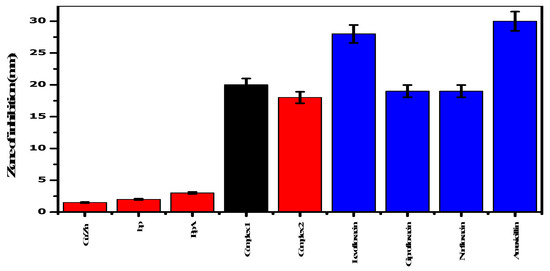 Both complexes (Figure 1) showed antibacterial activity compared with the standards, as shown in Figure 2. The zones of inhibition for complexes 1 and 2 measured 20 and 18 mm, respectively. Similarly, the minimum inhibitory concentration (MIC) values of the test complexes were evaluated using the dilution method. The MIC values for complexes 1 and 2 were 46.87 ± 1.822 and 47.87 ± 1.345 µg/mL, respectively.