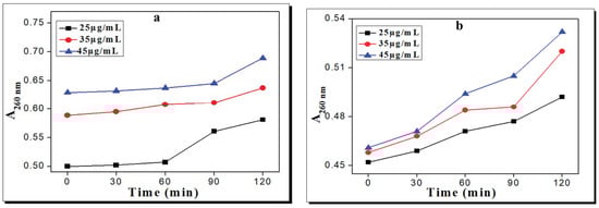The potential of the test complexes (1 and 2) for outer membrane spoilage was assessed by determining intracellular substances that tear upon interaction with bacterial cells [42]. The test bacterium from the agar plate was transferred and incubated at 37 °C for 24 h in the broth medium. The one-day-old culture was centrifuged and suspended in PBS solution. Finally, the optical density of the resulting culture was calibrated to 0.7 at 420 nm. Then, the different concentrations of test samples (1.5 mL) were mixed with the bacterial inoculum (1.5 mL), and the released intracellular substances at different time intervals were measured using a UV-Vis spectrophotometer.