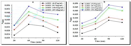 This bioassay is based upon the β-galactosidase releases present in the inner membrane of E. coli. The actual substrate for β-galactosidase is lactose. This enzyme cleaves the mimic molecule (ONPG) into a chromogenic product o-nitrophenol, which was measured at 420 nm [31]. Bacterial cells were exposed to varying concentrations (i.e., 1 × MIC, 2 × MIC, 3 × MIC, and 4 × MIC) of zinc and copper complexes, and the cleavage rates were measured, as shown in Figure 4a,b. The maximal hydrolysis rate of ONPG was obtained at 60 min for complex 1, while for complex 2 it was obtained at 90 min. After the reported time interval, the rate of ONPG hydrolysis was reduced, strongly suggesting a loss of enzyme activity. However, complex 1 exhibited severe inner-membrane-damaging activity with an increase in the dose, as shown by an enhanced A420 value, indicating greater permeability for its entry than complex 2. The possible mechanisms for the bactericidal actions of these complexes might be the binding of the complexes to the membrane or the passive diffusion of complexes through the cell membrane, resulting in membrane permeability.