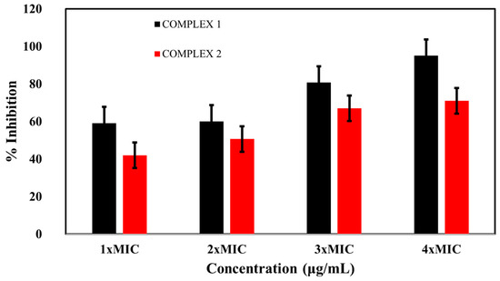 Both complexes showed greater inhibition of E. coli biofilm formation with increasing concentrations. Complex 1 caused 59, 60, 80, and 95% inhibition of the E. coli biofilm at 1 × MIC, 2 × MIC, 3 × MIC, and 4 × MIC, respectively. Similarly, the inhibition rates of the biofilm by complex 2 were 42, 50, 67, and 71% at the mentioned concentrations, respectively (Figure 6). These results suggest that both complexes have the ability to inhibit biofilm formation.