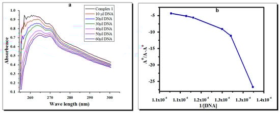 (a) UV-Vis spectra of the Zn complex with DNA at different concentrations of the complex and blank (b) A°/A−A° vs. 1/[DNA] and the binding constant for the Zn complex with E. coli DNA.