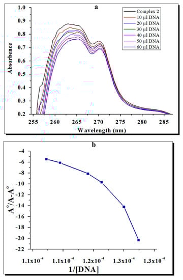 (a) UVVis spectra of the Cu complex with DNA at different concentrations of the complex and blank (b) A°/A−A° vs. 1/[DNA] and the binding constant for the Cu complex with E. coli DNA.
