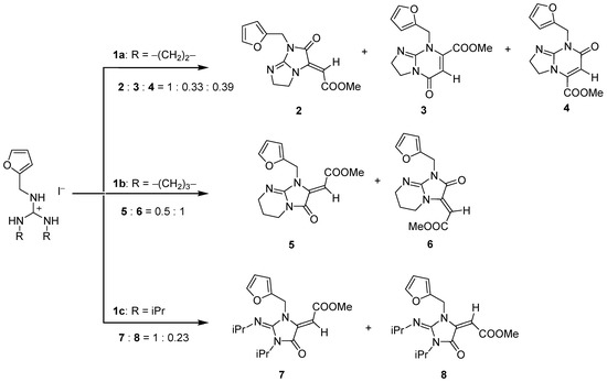 Structures of various products obtained by AMA/CYC tandem reaction of guanidinium salts 1a–1c with DMAD [23]. Relative ratios are calculated from the 1H NMR spectra of the reaction mixtures.
