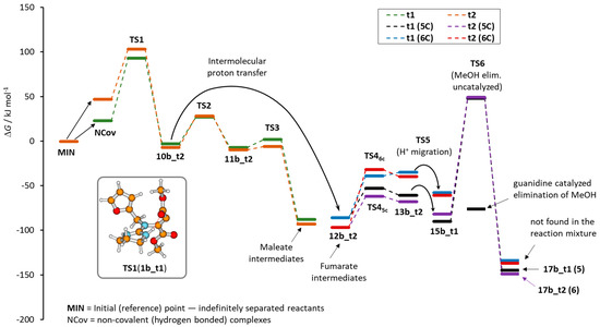 The stability of so-formed “zwitterionic” intermediates 10(a−c) is further increased upon conversion to maleate or fumarate derivatives (11(a−c) and 12(a−c), respectively). The process includes proton transfer from the guanidinium moiety to the newly formed center with a partially anionic character. Modeling the intramolecular proton transfer between the guanidinium and fumarate anion subunits resulted in inversion at the anionic center and structural reorganization to maleates. Inspection of the isolated product structures shown in Figure 1 reveals that maleate intermediate could be responsible for the formation of product 8 only. Besides that, their configuration does not allow cyclization to the remote carboxylic group under a low-energy regime while the cyclization to the proximate carbonyl atom is assumed to be similar to the fumarate isomers. Therefore, maleate isomers were neglected from further TS structure calculations but the structures and energies of the corresponding minima were calculated (Supplementary Materials). The intermediates 10(a−c) are already pre-organized to produce fumarates by direct protonation and they are most likely formed by the proton transfer mediated by some component in the reaction mixture (moisture, methanol as a by-product of the reaction, or another molecule of guanidine that assists the intramolecular 1,5-hydrogen shift). Regardless, this step is not considered to affect the reaction kinetics.