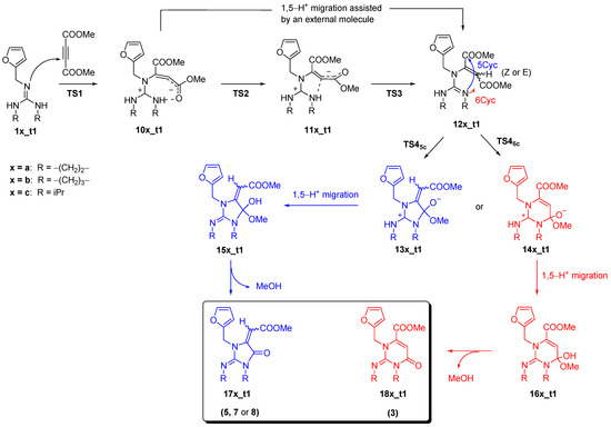 The reaction mechanism could be divided into two sections: the aza-Michael addition (AMA) and cyclization (CYC). The calculation predicts the nucleophilic attack of neutral guanidine on DMAD to be energetically the most demanding step of the AMA section. In all computed structures, the barrier for the initial nucleophilic attack (TS1) from the furfuryl-substituted nitrogen atom is lower in energy and the difference ranges from 3 kJ mol−1 (1b_t1/1b_t2) to 14 kJ mol−1 for the 1c_t1/1c_t2 pair with M06-2X providing a slightly smaller range but larger energy differences than B3LYP. The large difference in the calculated barriers for the reaction of 1c tautomers indicates that the t2 reaction channel will not be populated and the products will predominantly be formed from 1c_t1 tautomers. As noted in the previous section, the relative stabilities of these two tautomers (Figure 2) additionally support such reasoning. Along with that, the relative stabilities of the isomers 10c_t1 and 10c_t2 also support the predominance of the t1 path. The differences in barrier heights calculated for tautomers of the other two guanidine derivatives are rather small at the B3LYP level of theory albeit a slight preference for the t1 path is indicated. Nevertheless, concurrent reactivity is expected in both cases. On the other hand, M06-2X predicts comparable reactivities of the 1b_t1/1b_t2 pair to those of the 1c_t1/1c_t2 pair. That would mean no or low abundance of the products formed initiated by the nucleophilic attack of 1b_t2 tautomer. This result contrasts with the experimentally observed ratio of the products (Figure 1). The stability of the intermediates 10a_t1 and 10a_t2 as well as their 1b analogs indicates the preference for the t2 path as consistently predicted by both DFT approaches. Up to this point, the reaction is predicted to be practically thermoneutral (M06-2X) and could be considered reversible.
