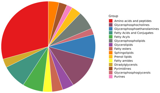 In this work, untargeted metabolomics based on ultra-high-performance liquid chromatography, coupled with high-resolution mass spectrometry (UHPLC-HRMS), was used to provide a comprehensive screening of the chemical composition of Coppa Piacentina PDO samples during different ripening times. Overall, the approach used allowed the identification of 1052 compounds according to a level 2 confidence in annotation (i.e., putative identification + structural confirmation of the Top N ions). All the compounds annotated are reported in the Supplementary Materials (Table S1) including their name, total identification (ID) score, reference m/z, chemical formula, INCHIKEY code, MS1 isotopic spectrum, and MS/MS spectrum. By exploiting the information gained from quality control (QC) samples (i.e., annotated by data dependent MS/MS approach) we structurally confirmed 234 metabolites against the comprehensive database FoodDB (Table S1). Overall, consistent with the nature of the matrix analyzed (i.e., meat samples), we found a great abundance of amino acids and peptides (showing the highest significant enrichment ratio; Table S1), followed by several lipid subclasses, such as glycerophospholipids, fatty acids and conjugates, fatty esters, prenol lipids, fatty esters and amides, diradylglycerols, purines, and pyrimidines (Figure 1).