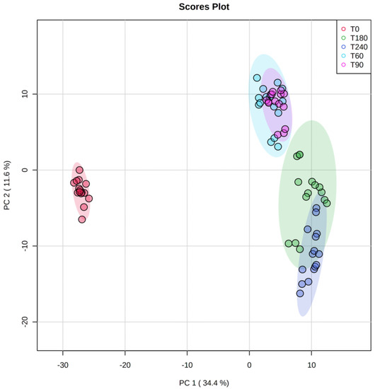 Score plot deriving from unsupervised principal component analysis of the untargeted metabolomic profile of Coppa Piacentina PDO samples during ripening time (i.e., T0, T60, T90, T180, and T240 days). Abbreviations: principal component 1 (PC1); principal component 2 (PC2).