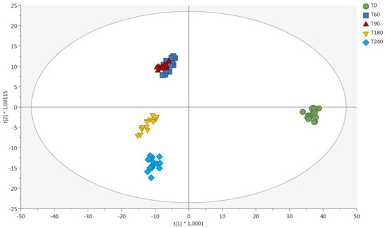 Score plot deriving from supervised orthogonal projection to latent structures discriminant analysis. The output was built considering the untargeted metabolomic profile of Coppa Piacentina PDO samples during ripening time (i.e., T0, T60, T90, T180, and T240 days). Abbreviations: first latent vector (t[1]); second latent vector (t[2]).
