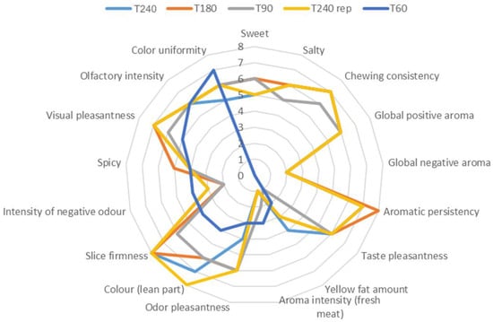 During the ripening of dry-cured hams, intensive biochemical reactions occur, leading to a significant change in the composition and, consequently, in the sensorial properties of the product. The sensory properties of dry-cured meat products are related to intramuscular lipid composition and to the extent of proteolysis, lipolysis and the lipid oxidation during processing [32]. In order to investigate the effect of ripening on the sensory characteristics of Coppa Piacentina PDO, a panel test was performed and the mean scores for sensory characteristics are reported in Figure 4.