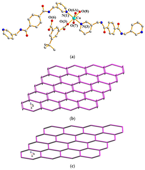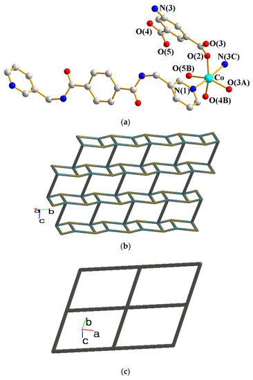 The crystal structure of 1 conforms to the triclinic space group Pī and the asymmetric unit consists of one Co(II) cation, two halves of an L ligand, one 5-ter-IPA2− ligand, and two coordinated water molecules. The Co(II) metal center is coordinated by two pyridyl nitrogen atoms of two L ligands [Co-N = 2.1346(12) − 2.1816(12) Å], two oxygen atoms from two 5-ter-IPA2− ligands [Co-O = 2.0587(10) and 2.1362(10) Å], and two coordinated water molecules [Co-O = 2.0794(10) and 2.1411(10) Å], forming a distorted octahedral geometry, as in Figure 2a. Two Co(II) ions are bridged by two 5-ter-IPA2− ligands to form dinuclear units, which are connected by L ligands to afford a 2D layer. Considering the Co(II) cations as 4-coordinated nodes, 5-ter-IPA2 as 2-connected nodes, and L ligands as linkers, the structure of 1 can be regarded as a 2,2,4-connected net with the point symbol (12)(4⋅125)(4) (standard representation), as in Figure 2b, determined using ToposPro [12]. Moreover, if the dinuclear units are considered as 3-coordinated nodes, the structure can be further simplified as a 3-connected net with the (63)-hcb topology (cluster representation) [13], as in Figure 2c.