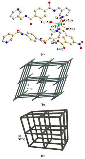 (a) Coordination environment of the Co(II) ion in 2. Symmetry transformations: (A) −x + 1, −y, −z; (B) x + 1, y, z. (b) A drawing showing the 3,5T1 topology. (c) A drawing showing the pcu topology.
