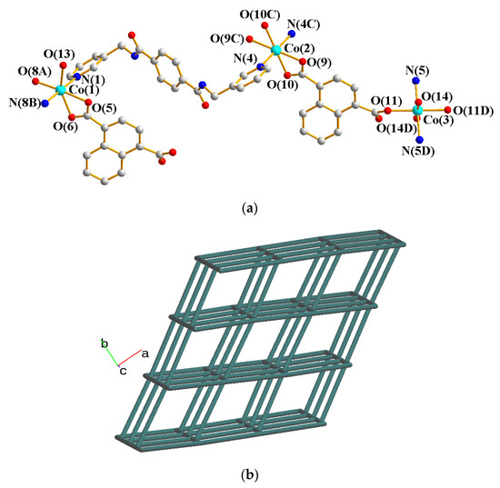 Crystals of 6 conform to the monoclinic space group P21/c with each asymmetric unit consisting of one and two halves of a Co(II) cation, two L ligands, two 1,4-NDC2− ligands, two coordinated water molecules, and five co-crystallized water molecules. Figure 7a shows the coordination environment of the Co(II) metal centers, which are all 6-coordinated. The Co(1) atom is coordinated by two nitrogen atoms from two L ligands [Co-N = 2.134(2) and 2.138(2) Å], three oxygen atoms from two 1,4-NDC2− ligands [Co–O = 2.0257(18) Å – 2.19740515(19) Å], and one oxygen atom from the coordinated water molecule [Co-O = 2.0817(19) Å]. The Co(2) atom is located at the inversion center, which is coordinated by two pyridyl nitrogen atoms [Co–N = 2.114 (2) Å] from two L ligands and four oxygen atoms from two 1,4-NDC2− ligands [Co–O = 2.1128(17)–2.1415(18) Å], whereas the Co(3) atom, which is also located at the inversion center, is coordinated by two nitrogen from two L ligands [Co–N = 2.145(2) Å], two oxygen atoms from two 1,4-NDC2− ligands [Co–O = 2.0813(17)] and two oxygen atoms from two water molecules [Co–O = 2.1497(18)]. The Co(II) ions are linked by the 1,4-NDC2− and L ligands to form a 3D framework. If the Co(II) ions are defined as 4-connected nodes and the L and 1,4-NDC2− ligands as linkers, the structure of 6 can be simplified as a 4-connected net with the (65⋅8)-cds topology, as in Figure 7b.