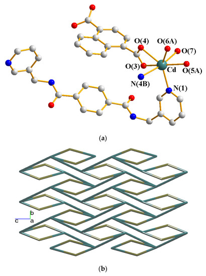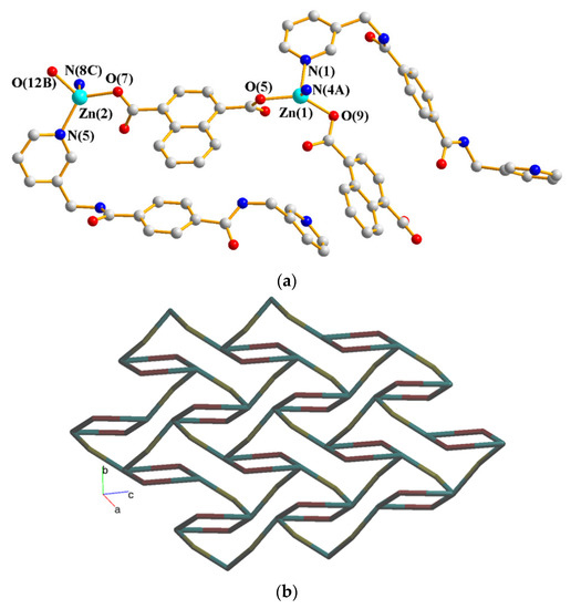 Coordination polymers (CPs) have been intensively investigated by scientists in recent years because of their intriguing architectures and prospective applications in magnetism, luminescence, catalysis, gas storage, and sensing [1,2,3,4]. The coordination of spacer ligands to metal ions during the self-assembly process may result in the production of infinite one-dimensional (1D), two-dimensional (2D), or three-dimensional (3D) CPs, which are subject to the careful selection of metal ion and spacer ligands with diverse functionalities and flexibility. Despite the fact that many fascinating CPs have been reported, control of the structural variety remains a difficulty in the field of crystal engineering, and the factors that influence the structural diversity are less well understood [5,6].