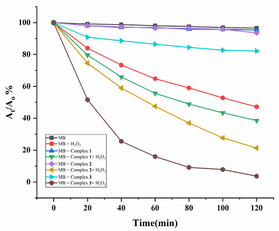 The governing role of CPs in the photodegradation of organic pollutants has been a subject of current interest [14,15,16,17,18,19]. Complexes 1–3, which differ in the fifth position of the phenyl ring of the dicarboxylate ligands, i.e., the tert-butyl, NO2 and NH2 groups, respectively, thus, provide a unique opportunity to compare the substituent effect on the photodegradation. Methylene blue (MB, C16H18ClN3S) was selected as the dye contaminant, and the experiments were carried out with 30 wt % H2O2 under 365 nm UV light. Time-dependent absorption spectra of the MB solutions under 365 nm UV light are provided as Figures S1–S8.