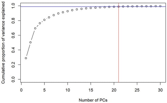 Our ultimate objective was to develop a model for identifying HE traces in analyzed FTIR spectra. For the initial study, linear discriminant analysis (LDA) was chosen as LDA aims to maximize the between-class variance while minimizing the within-class variance through the application of linear discriminant functions [39]. As a first step, the spectra were divided into two subsets: a training set to build the model and a testing set to evaluate the predictive model using a cross-validation procedure. In our work, we decided to use spectra collected after high-order explosions as a training set (193 spectra), and the spectra collected from the remnants after low-order explosions as a test set (553 spectra). Overall, 100% of the variabilities in the system were explained by only two first LDs, but additionally, the procedure was ended with the warning that all variables are collinearly dependent. It is very typical for the spectroscopic experiment results that the number of input variables (features) greater than the number of training samples leads to over-fitting. Our data have this characteristic, with 1501 variables versus 193 spectra. In order to remove the over-fitting and collinearity of highly correlated spectral data, further reduction of a number of variables was required. The PCA algorithm was implemented for data dimensionality reduction. The PCA model was built by applying the normalized and scaled FTIR spectra within the region 1900–400 cm. PCA runs an orthogonal transformation to convert data (of possibly correlated variables) into a batch of unique variables called principal components (PCs) that successively augment variance. It is confirmed to be a basic and efficient dimensionality reduction method for spectroscopic data. New, uncorrelated variables PCs are, by design, orthogonal and are ordered in such a way that the first carries the most variance of the system, the second most of the remaining variance, and so on. Before implementing the PCA algorithm, the dataset features were centered by excluding the mean and scaled. The first principal component (PC1) explained 28.9% of the variance, the second 21.6%, and the third 18.9%. The cumulative variance explained by PC4 to PC7 was relatively high, around 18.1%. The total variance explained by the first three principal components was 69.4% for our datasets. The validation of the minimum number of PCs that explain the majority of the system variability is one of the major challenges when applying PCA to a dataset and it depends on the particular problem [40]. There is no standard approach for selecting the appropriate number of PCs. One approach is to study a scree plot and search for “elbow” to establish the correct amount of PCs. Unfortunately, very often the plot has no clear “elbow” feature. Kaiser’s rule [41] suggests leaving the PCs with eigenvalues above 1, but in this case the number of factors extracted is usually about one third the number of variables in the original dataset regardless of whether many of the additional factors are noise. Cangelosi and Goriely [42] summarized the standard rules of thumb to detect the number of components in a study of component retention in PCA with application to cDNA microarray data. In this study, we decided to retain those PCs that cumulatively explain at least the 99% of the overall variance. Figure 2 shows that this condition is achieved when we choose to keep the first 21 PCs. Then, our new projected data consist of 746 spectra (observations), each with 21 features (variables).