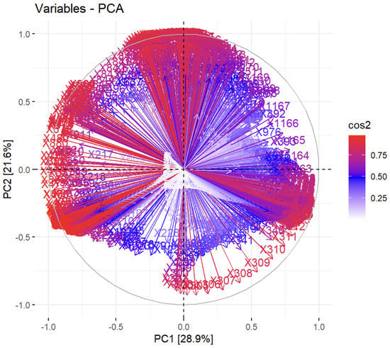 This plot, also known as the variable correlation plot, presents the relationship between all original variables (wavenumbers in this case). Positively correlated variables are gathered closely, while negatively correlated variables are located on opposite sectors of the plot’s origin. The parameter (squared cosine or squared coordinates) was used in Figure 3 for color-coding the arrows representing the variables. A high value of suggests a satisfactory representation of the variable in the principal component space. If the variable is completely expressed by solely the first two principal components (PC1 and PC2), the sum of the for these two PCs is equal to 1 and the variables are positioned on the circle of correlations. For some variables, more than two components are needed to accurately describe the data, and in these cases the variables are positioned inside the circle of correlations. In Figure 3, variables with low values are colored white, variables with medium values of are colored blue, and eventually, variables with high values are colored red. This type of plot is not usually very useful for spectroscopic data, since many of the original variables (wavenumbers) are highly correlated (being part of the same absorption band). However, it shows that the analyzed system is very complex and more than two PCs are required to fully explain its variability.
