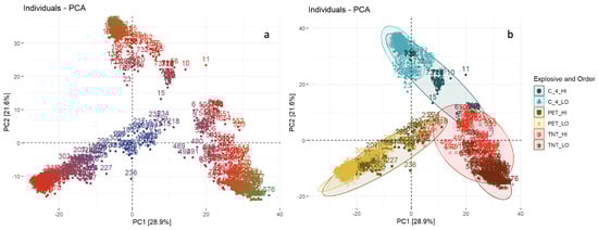 Principal component analysis (PCA). The scatter plot in PC1/PC2 space; each point corresponds to one spectrum and the points are colored by: the contribution of each observation to PC (a) and explosive material and order of explosions (b).