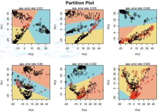 The discussed example illustrates that the first two PCs do not fully explain the variability of the system. To determine if other combinations of two PCs might provide better discrimination, partition plots of 2D principal component space were calculated using LDA algorithms. LDA manipulates data to break down prognosticator variables into categorical regions with linear boundaries. LDA orders dimensions based on how much segregation each group gains, enlarging the difference and diminishing the overlap of clusters. LDA can be regarded as the supervised method of figuring out the directions (linear discriminants) that describe the axes in order to maximize separation between different classes. Figure 5 presents the partition plots with pairs from PC1 to PC4. The colored areas represent the limits of each classification region, with yellow for PETN, orange for TNT, and blue for C-4. The observations are marked with the corresponding letters (P for PETN, T for TNT, and C for C-4) and located in the appropriate colored region, which indicates their predicted membership by LDA. Black letters indicate that the sample was correctly allocated, while red letters show that the sample was misclassified by the model. The yellow dots on the plots represent the mean value for each group. As can be seen, most of the observations were correctly classified for the region corresponding to the PETN, TNT and C-4 category only in PC1 vs. PC2 space; indeed, the apparent error rate calculated for these dimensions has the lowest value in the comparison to errors obtained for the other combinations of dimensions PC1 to PC4.