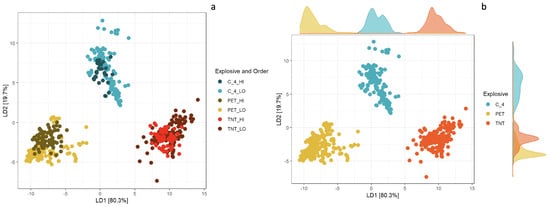 As seen in Figure 6, a scatter plot of all observations in the training dataset for the first two values of linear discriminant functions shows that the training set (built on high-order explosion spectra) nicely overlaps with the points belonging to the test set (low-order spectra). Both sets are clustered in the first two linear discriminant functions space according to the type of explosive used for low- or high-order blasts. The percentage of separation achieved by LD1 is 80.3%, and 19.7% in the case of LD2. Additionally, probability density functions (PDF) have been calculated to check their distributions over the range of values that a variable can take. PDF (presented in Figure 6 as the margin plots separately for each HE material) for LD1 shows a clear separation between TNT and C-4, and some overlapping between PETN and C-4. This overlapping is well-resolved when PDF for LD2 is considered.