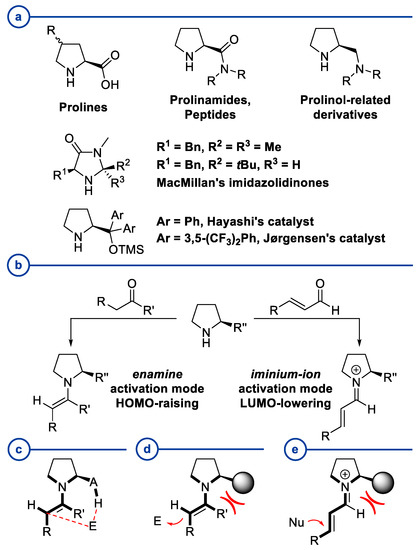 (a) Structures of the progenitors and most-commonly used organocatalysts; (b)–(e) the fundamental stereoselective activation mode of pyrrolidine-based organocatalysts.