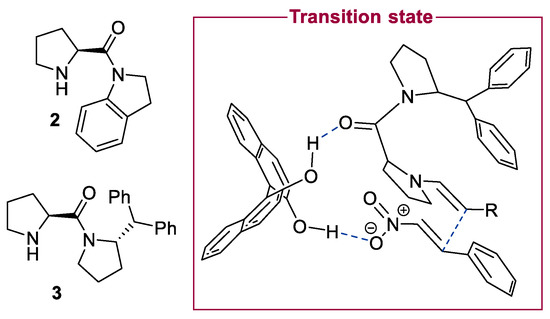 In 2012, Sirit et al. investigated the enantioselective Michael addition of aldehydes to nitrostyrenes in apolar solvents mediated by two prolinamides which were fully substituted on the amide moiety (Figure 2), thus lacking the hydrogen-bond donor group typical of proline [31]. The use of a co-catalyst containing an acidic hydroxyl group was mandatory to achieve good performance, with (S)-1,1′-bi-2-naphthol providing the best results as a matched pair. The authors suggested a transition state model organized by a network of hydrogen bonding interactions (Figure 2), in which the amide acts as bulky substituent and the better enantioselectivity of catalyst 3 with respect to 2 could derive from the additional stereocenter.