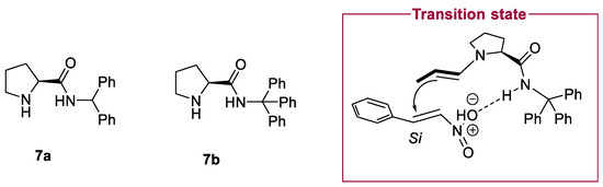 Lin and Wei, in 2014, exploited the reactivity of two new prolinamides characterized by bulky achiral substituents on the amide function (Figure 3) [33]. The most efficient Michael addition was achieved with the most hindered catalyst (S)-N-tritylpyrrolidine-2-carboxamide 7b (10 mol%) at −20 °C, which provided good yields and enantiocontrol but moderate dr with some substrates.