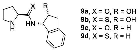 Regarding the asymmetric direct aldol reaction, in 2008, Nájera et al. reported on the preparation of two new prolinamides derived from (1S,2R)-cis-1-aminoindan-2-ol and (R)-1-aminoindane, and on the corresponding prolinethioamides, using Lawesson’s reagent (Figure 4) [37]. Their reactivity was evaluated in enantioselective solvent-free inter- and intramolecular aldol reactions. The best results were achieved with thioamide 9d, which showed good performance in low loading (5 mol%) and with only one equivalent of ketone. Further, 9d proved to be a superior catalyst to L-Pro and the corresponding prolinamides for the solvent-free tested reactions. Moreover, it was easily recovered and reused by a simple acid/base work-up.