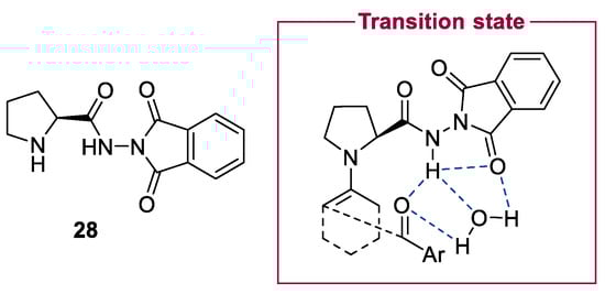 In 2014, the phthalimido-prolinamide 28 (Figure 9) was developed by Kumar et al. to promote the enantioselective direct aldol reaction of aromatic aldehydes with ketones under solvent- and additive-free conditions [47]. A small amount of water (5 mol%) improved the reaction rate and, slightly, the enantioselectivity. The authors supposed that water contributes to creating a more compact transition state, leading to higher stereoselectivity (Figure 9).