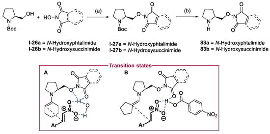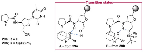 New bifunctional organocatalysts based on a nucleoside and proline, named AZT-prolinamides (Figure 10), were synthesized by Chandrasekhar et al. in 2014 to mediate the same enantioselective aldol reaction in additive-free water [48]. The results obtained with catalyst 29b were slightly inferior to those obtained for catalyst 29a, with both used at 15 mol% loading. The authors suggested that the nucleoside moiety acts as a steric controller and contributes to hydrogen bond stabilization along with the amide group. The prolinamide 29a provides an additional hydrogen bond due to the presence of the hydroxy group (A); conversely, the silylated prolinamide 29b exerts extensive steric coverage (B).