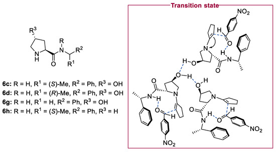 Some of the 4-hydroxy-prolinamides (Figure 11) synthesized by Kelleher et al. [32] in 2012 were applied by Singh in 2015 in the asymmetric aldol reaction using low catalyst loading (10 mol%) under solvent-free conditions, according to the green chemistry principles [49]. The trans-4-Hydroxy-(S)-prolinamide 6d, containing (S)-1-phenylethylamine, proved to be the best catalyst. The (S)-1-phenylethylamine and the additional 4-hydroxyl group in the trans position both positively influenced the enantioselectivity of the predominant anti-aldol product, with the 4-OH probably forming a network of intermolecular hydrogen bonds (Figure 11). Catalyst 6d can be reused for up to five cycles for the asymmetric aldol reaction between cyclohexanone (1.2 mmol) and p-nitrobenzaldehyde (0.4 mmol) using acetic acid (10 mol%) as the additive at 15 °C, obtaining a slightly lower ee but an improved dr.