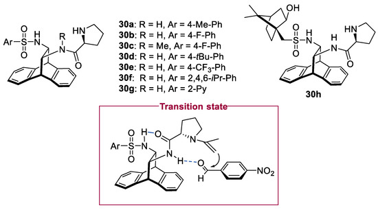 The asymmetric aldol reaction between acetone and aromatic aldehydes was selected to evaluate the performance of the novel bifunctional organocatalysts proposed by de Parrodi and coworkers in 2015 [51]. The homochiral L-prolinamido-sulfonamides 30a–h (Figure 12) were easily synthesized from enantiomerically pure (R,R)-11,12-diamino-9,10-dihydro-9,10-ethanoanthracene as a 1,2-diamine structural motif to be derivatized as both prolinamide and sulfonamide. The best results were achieved with catalyst 30d, bearing a strong electron-withdrawing substituent; however, the reaction scope was limited. To confirm the role of the sulfonamide-NH, the model reaction was carried out with the corresponding -NMe catalyst, leading to worse yield and stereocontrol. The diastereoisomeric organocatalyst obtained from the enantiomeric 1,2-diamine also provided worse ee. The calculated transition state structure evidenced an intramolecular hydrogen bond between the sulfonamide NH and the prolinamide C=O which may lock the proline conformation, affecting the selectivity.