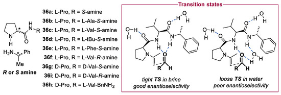 Series of dipeptide-like organocatalysts 36a–h, employed in the asymmetric aldol reaction in brine.