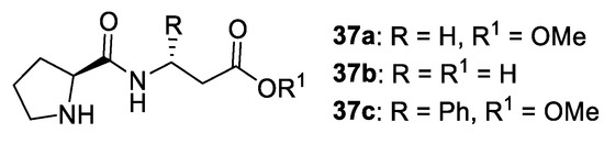 Aiming to develop sustainable enantioselective reactions, in 2015, Juaristi and co-workers applied three novel proline-based α,β-dipeptides to the asymmetric aldol reaction under solvent-free, high-speed ball milling (HSBM) conditions (Figure 17) [62]. The transformation proceeded in shorter times and with higher stereoselectivity with respect to the conventional protocols. The organocatalysts’ synthesis was carried out in solution, employing propanephosphonic acid anhydride (T3P) as an activating agent. Regarding the catalysts structure, it was found that: (i) the presence of a second stereocenter in the α,β-dipeptide did not improve the stereoselectivity, (ii) the free carboxylic group (37b vs. 37a) had no effect on the stereoselectivity and, (iii) due to the poor solubility of 37b under HSBM conditions, the aldol reaction showed low conversion.