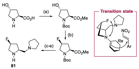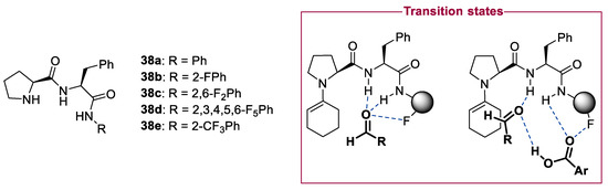 In 2018, Moutevelis-Minakakis and Kokotos synthesized proline-based fluorinated dipeptides as organocatalysts for the asymmetric aldol reaction both in organic and aqueous media [63]. The catalyst design aimed to improve the hydrogen bonding interactions and/or change the catalyst conformation that was adopted in the transition state (Figure 18). It was established that both the amide and fluorine moieties are essential to obtain good results in both organic and aqueous media (brine), with the 2-trifluoromethyl-aniline 38e being the best-performing dipeptide.