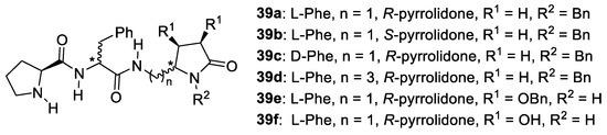 The same authors, in the same year, also proposed new hybrids which combined a dipeptide moiety with a 2-pyrrolidinone scaffold (Figure 19), derived from pyroglutamic acid, which promoted the asymmetric aldol reaction in both organic and aqueous media [64]. The authors observed: (i) a beneficial effect of the pyrrolidinone ring with respect to simple dipeptide, (ii) a matched effect between the peculiar absolute configurations of Phe and the stereocenter on the pyrrolidinone, (iii) that, in brine, more distance between the Pro-Phe dipeptide backbone and 2-pyrrolidinone is profitable, and (iv) that substituted pyrrolidinones provided worse results. Catalyst 39a was successfully recovered (73%); however, the enantioselectivity dropped when it was reused in a second reaction. These catalysts also showed interesting catalytic activity in the aldol reaction of ketone with ketones.