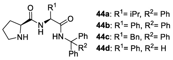 Novel tripeptides were also proposed in 2014 by Kokotos and Moutevelis-Minakakis to catalyze the asymmetric aldol reaction [54]. In this case, the organocatalysts were based on Pro-Phe (Figure 14) and used as tert-butyl esters in an organic solvent or water. The addition of 4-nitrobenzoic acid (20 mol%) and NaBr provided the best results in water, employing only two equivalents of ketone. The C-terminal amino acid determines the ability of the tripeptide (Pro-Phe-AA-OtBu) to perform efficiently in water or toluene.