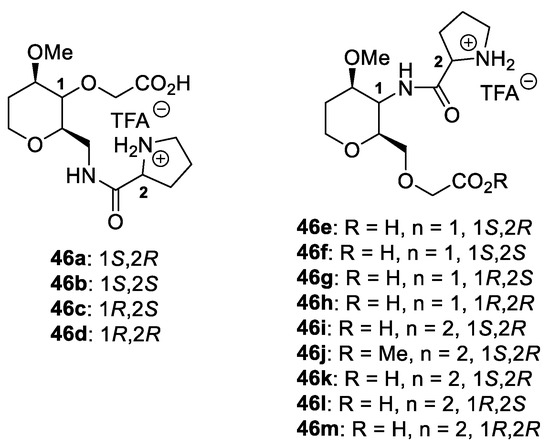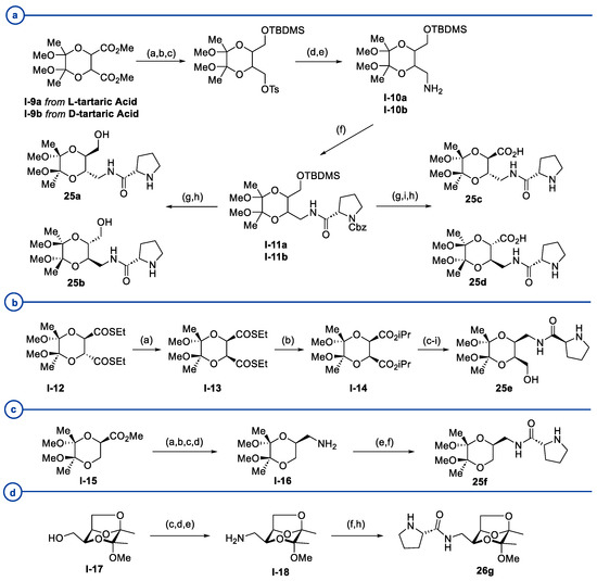 In 2012, Ventura’s group described the synthesis of a series of new pyrrolidine-based organocatalysts derived from tartaric and glyceric acids (Scheme 8) [45]. The authors supposed that the addition of extra stereocenters and suitably positioned functional groups can contribute to create new effective organocatalysts. The synthesis of catalysts 25a–d was accomplished in eight and nine steps, starting from dimethoxy-2,3-dimethyl-1,4-dioxane-5,6-dicarboxylate I-9, obtained in turn from L- or D-tartaric acid (Scheme 8a). The cis-catalyst 25e was prepared with some difficulties from dithioester I-12 (Scheme 8b). Organocatalyst 25f was readily obtained from glyceric acid methyl ester (Scheme 8c) and organocatalyst 26g was prepared from bicyclic product I-17 (Scheme 8d). The application of these catalysts to an asymmetric aldol reaction led to modest results. The catalysts were not generally applicable, probably because of the high conformational rigidity conferred by the dioxane ring.