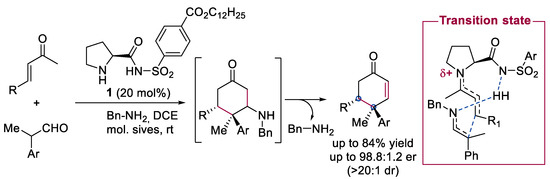 In 2010, Carter and coworkers proposed the new ester-containing proline aryl sulfonamide 1 (Scheme 1), which is able to catalyze the conjugate addition of racemic α,α-disubstituted aldehydes to acyclic unsaturated ketones, leading to cyclohexenones containing two adjacent stereocenters and including an all-carbon-quaternary carbon in high enantio- and diastereo-selectivity [29,30]. In this multicomponent coupling, benzylamine was crucial, presumably forming the enamine of the aldehyde which reacts with the chiral iminium ion of the ketone (Scheme 1). The lipophilic substituent on the aryl sulfonamide significantly improved the catalystsolubility in apolar solvents and its reactivity compared to proline.