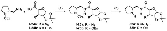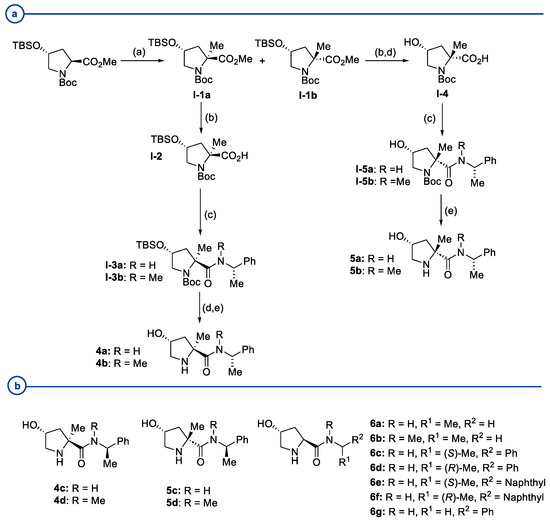 (a) Synthesis of 4-hydroxyprolinamides 4a,b and 5a,b. Reagents and conditions: (a) (i) LiHMDS, THF, −20 °C; 1.5 h; (ii) CH3I, THF, 18 h, −20 °C to rt; I-1a: 48%, I-1b: 26%; (b) NaOH in MeOH/H2O (1:1), reflux, 5 h; I-2: 48%, I-4′: 76%, (c) for I-3a and I-5a: (S)-1-Phenylethylamine, HATU, DIPEA, DMF, rt, 4 h; I-3a: 42%, I-5a: 50%; for I-3b and I-5b: (S)-N,α-dimethylbenzylamine HATU, DIPEA, DMF, rt, 4 h; I-3b: 33%, I-5b: 31%; (d) TBAF (1M), THF, 0° C, 5 h; I-3a’: 92%, I-3b’: 98%, I-4: quantitative (e) 50% TFA/DCM, rt, 16 h., 4a: 28%, 4b: 23%, 4c: 27%, 4d: 24%. (b) Other hydroxyprolinamide catalysts obtained by Kelleher and co-workers.