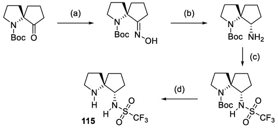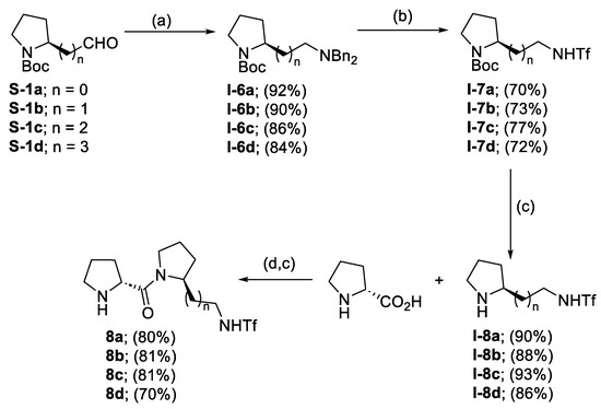 Afterwards (2019), Ramapanicker and co-workers prepared five D-prolinamides from the corresponding 2-(trifluoromethylsulfonamidoalkyl)pyrrolidines (Scheme 3), to be used in the Michael addition of aldehydes to β-nitroalkenes at room temperature without additives [34]. The authors envisaged that the trifluoromethanesulfonamide (−NHTf) group could offer useful catalytic performance, acting as an H-bond donor instead of the carboxylic or phosphonic acids present in the peptidic catalysts which were previously proposed by Wennemers [35] and Lecouvey [36]. The synthetic strategy started with the preparation of the NHTf-substituted pyrrolidines in four high yielding steps from the corresponding aldehydes (reductive amination, hydrogenolysis, sulfonamide synthesis, and N-Boc deprotection; Scheme 3). The following coupling with N-Boc-D-proline and deprotection furnished the catalysts. The superior results obtained in the nitro-Michael reaction with catalyst 8c suggested that an optimal distance between the secondary amine and the hydrogen bond donor (NHTf) is needed. Good yields and stereoselectivities were observed; however, an excess of aldehyde, 10 mol% of catalyst, and at least two days were required.