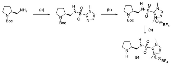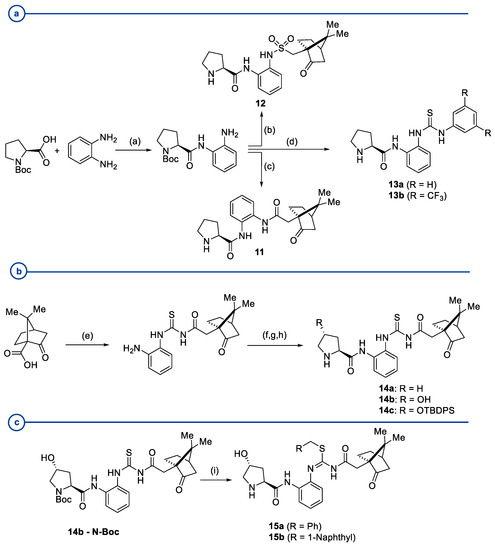 (a) Synthesis of prolinamides organocatalyst 11, 12, and 13a,b. Reagents and conditions: (a) ClCO2Et, Et3N, DCM, 0 °C to rt; (b) (i) Camphorsulfonyl chloride, Et3N, DCM, 0 °C. 1 h; (ii) TFA, DCM, 0 °C, 1 h, 65%; (c) (i) Ketopinic chloride, Et3N, DCM, 0 °C. 1 h; (ii) TFA, DCM, 0 °C, 1 h, 65%; (d) For 13a: (i) thiocyanatobenzene, DCM, 0 °C to rt; (ii) TFA, DCM, 0 °C, 1 h, 60%; For 13b: (i) 1-thiocyanato-3,5-bis(trifluoromethyl)benzene, DCM, 0 °C to rt; (ii) TFA, DCM, 0 °C, 1 h, 64%. (b) Synthesis of prolinamides organocatalyst 14a–c. Reagents and conditions: (e) (i) SOCl2, reflux; (ii) NH4SCN, acetone; (iii) o-phenylenediamine; (f) For 14a: N-Boc-L-Proline, ethylchloroformiate; for 14b,c: N-Boc-4-hydroxy-L-Proline, ethylchloroformiate; (g) Only for 14c: TBDPSCl, DMAP, DCM; (h) TFA, DCM. (c) Synthesis of prolinamides organocatalyst 15a,b. Reagents and conditions: (i) (i) RCH2Br, NaH, THF, 0 °C; (ii) TFA, DCM; 15a: 61%, 15b: 45%.