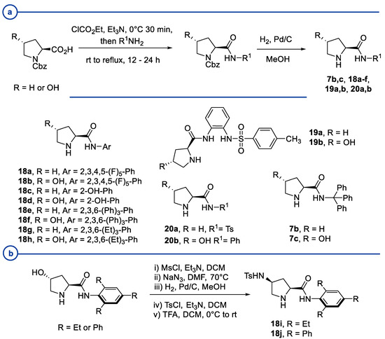 (a) Synthesis of prolinamide-organocatalysts 7b,c, 18a-h, 20 applied in the organocatalytic Biginelli reaction. (b) Synthesis of prolinamide-organocatalysts 18i,j applied in the same Biginelli reaction.