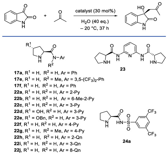 The aldol reaction of isatin with acetone was selected by Lennon and coworkers in 2011 to evaluate the reactivity and selectivity of a family of simple prolinamides, among which were N-pyridyl and N-quinolinyl derivatives (Scheme 6) [43]. The authors hypothesized that a combination of hydrogen bonding and π–π stacking of the aromatic rings of the catalysts with isatin were responsible for the observed catalytic performance. The nitrogen position in the aromatic ring had a significant effect on the enantioselectivity, with the 3- and 4-aminopyridinyl catalysts 22c and 22f, and the 3-aminoquinolinyl catalyst 22i, yielding the best results. The presence of a second stereogenic center in the organocatalyst led to inferior stereocontrol. The amide N–H played a crucial role and an enhanced N–H acidity led to interesting results (catalysts 17e and 24a, the last containing a sulfonamide). Conversely, the binding to the N–H of isatin may not have played a significant role.