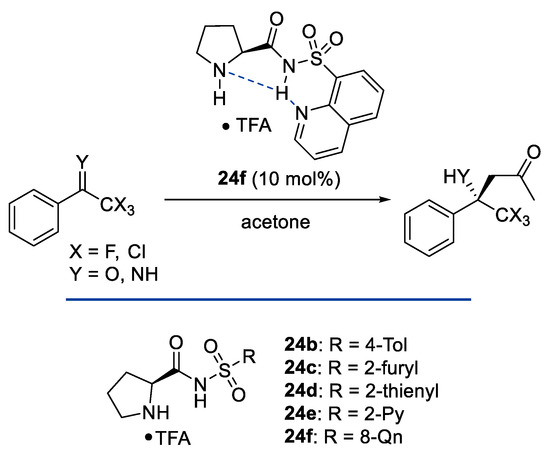In the same year, Nakamura’s group investigated the enantioselective cross-aldol reaction between acetone and trihalomethyl ketones or imines promoted by N-(8-quinolinesulfonyl)prolinamide 24f and found it to be the best organocatalyst (Scheme 7) [44]. The MO calculations suggested that the hydrogen bonding between the sulfonimide proton and the 8-quinolyl nitrogen plays a remarkable role in determining the reaction enantioselectivity.