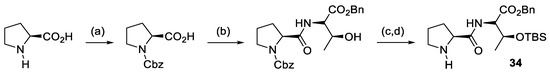 Synthesis of dipeptide organocatalyst 34. Reagents and conditions: (a) CbzCl, NaOH, 0 °C, 2 h, 93%; (b) O-Bn-L-threonine, EDC, HOBt, DCM:DMF (4:1), rt, 14 h, 92%; (c) TBSCl, imidazole, DCM:DMF (10:1), rt, 24 h, 78%; (d) Pd(OH)2/C, H2 (1 atm), rt, 12 h, 74%.