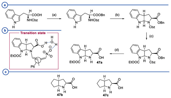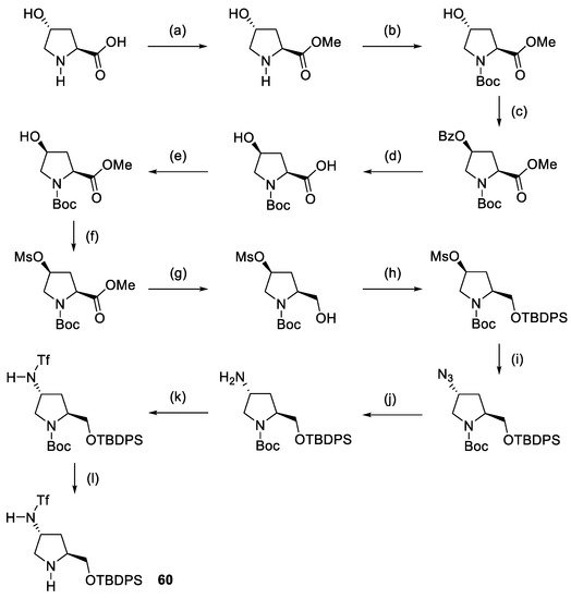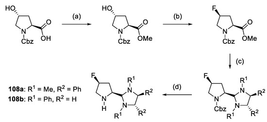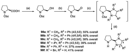 (a) Synthesis of organocatalysts 25a–d. Reagents and conditions: (a) LiAlH4, THF, 0 °C to rt, 81–98%; (b) (i) NaH, THF, rt; (ii) TBDMSCl, 85–89%; (c) TsCl, pyr, DMAP, 0 °C to rt, 80–85%; (d) NaN3, DMF, 70 °C, 99%; (e) H2 (50 psi), Pd/C, AcOEt/EtOH, 88–90%; (f) L-Pro-Cbz, HOBt, EDC, Et3N, DCM, 0 °C to r.t, 88–90%; (g) TBAF, THF, rt, 85–97%; (h) H2 (50 psi), Pd/C, MeOH, 25a: 91%, 25b: 87% , 25c:97%, 25d: 87%;(i) BAIB/Tempo, DCM/H2O, 84–97%. (b) Synthesis of organocatalysts 25e. Reagents and conditions: (a) (i) LDA, THF, −78 °C; (ii) MeOH, 98%; (b) Ti(OiPr)4, iPrOH, 10 °C, 10 days, 82%; (c) LiAlH4, THF, 70 °C 96%; (d) (i) NaH, THF, rt; (ii) TBDMSCl, 60%; (e) NH3, DIAD, PPh3, THF, 0 °C, 84%; (f) H2 (50 psi), Pd/C, AcOEt/EtOH, 99%; (g) L-Pro-Cbz, HOBt, EDC, Et3N, DCM, 0 °C to r.t, 81%; (g) TBAF, THF, rt, 98%; (h) H2 (50 psi), Pd/C, MeOH, 99%. (c) Synthesis of organocatalysts 25f. Reagents and conditions: (a) (i) LDA, THF, 97%; (b) TsCl, pyr, DMAP, 0 °C to rt, 95%; (c) NaN3, DMF, 70 °C, 93%; (d) H2 (50 psi), Pd/C, AcOEt/EtOH, 99%; (e) L-Pro-Cbz, HOBt, EDC, Et3N, DCM, 0 °C to r.t, 93%; (f) H2 (50 psi), Pd/C, MeOH, 99%. (d) Synthesis of organocatalysts 26g. Reagents and conditions: (c) TsCl, pyr, DMAP, 0 °C to rt, 87%; (d) NaN3, DMF, 70 °C, 90%; (e) H2 (50 psi), Pd/C, AcOEt/EtOH, 99%; (f) L-Pro-Cbz, HOBt, EDC, Et3N, DCM, 0 °C to r.t, 83%; (h) H2 (50 psi), Pd/C, MeOH, 99%.