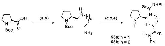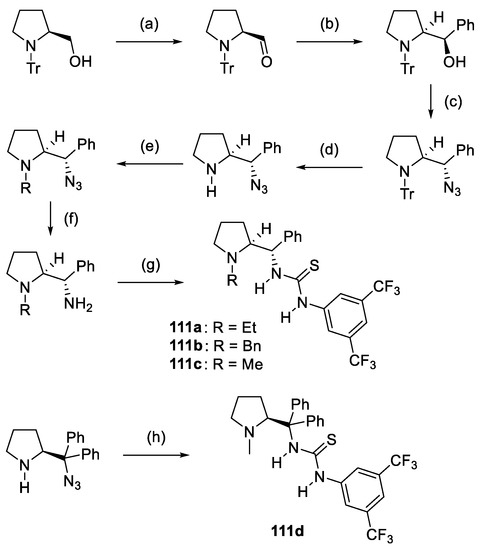 - Zhang, H.; Chuan, Y.; Li, Z.; Peng, Y. 4-Aminothiourea Prolinol Tert-Butyldiphenylsilyl Ether: A Chiral Secondary Amine-Thiourea as Organocatalyst for Enantioselective Anti-Mannich Reactions. Adv. Synth. Catal. 2009, 351, 2288–2294. [Google Scholar] [CrossRef]